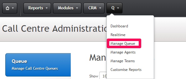 In the Legacy Portal, select “Manage Queue” from the Q menu: