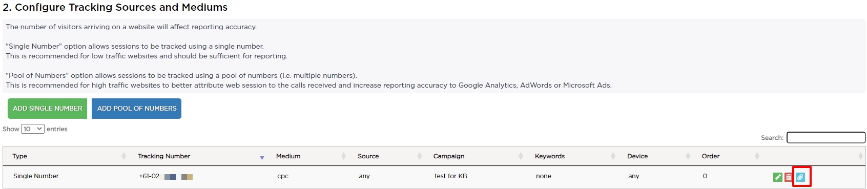 Once you configure a domain for the tracking configuration (see Step "Configure Website Domains"), each number displayed in the Configurations area will display an "attachment" link.