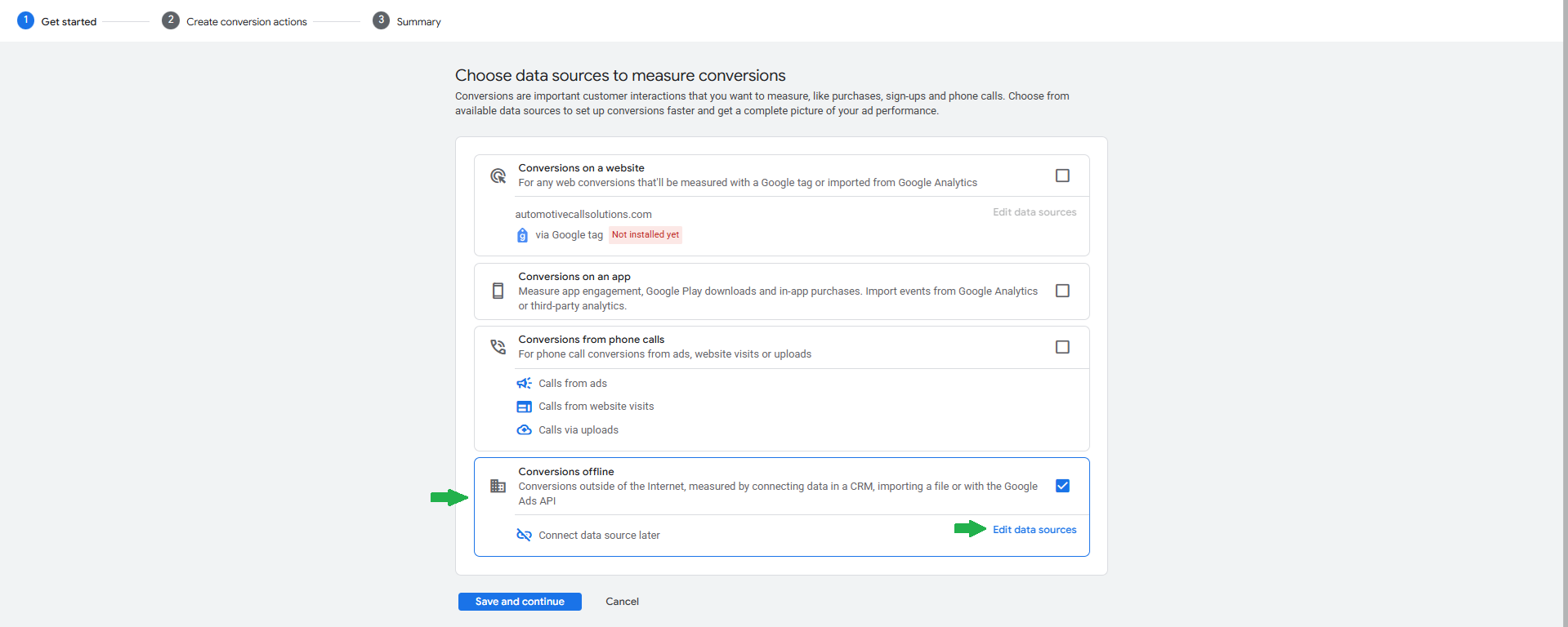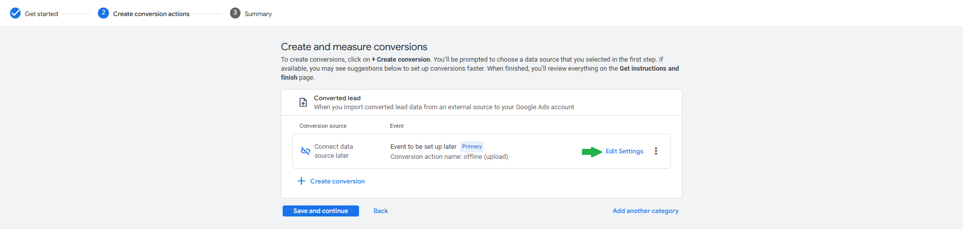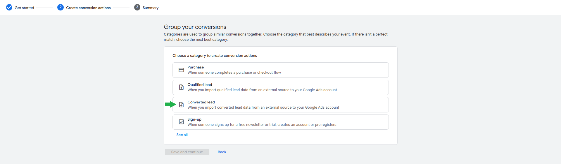 On the Choose a category to create conversion actions, Click on the See all and choose the Converted lead, then Click Save and continue.