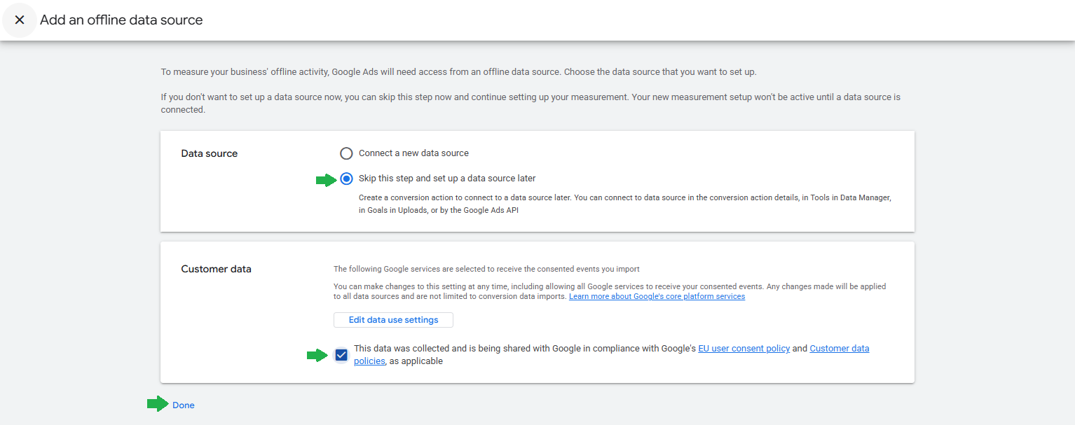 Choose the Skip this step and set up a data source later, and tick the Google's compliance consent and click Done. Proceed to click on the Save and continue button.