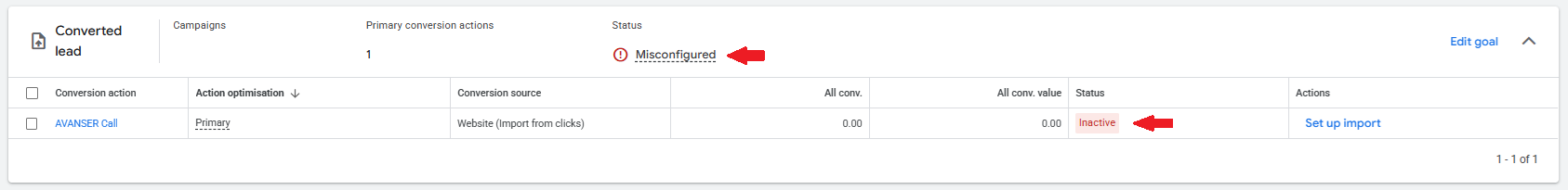 After setting up the conversion on your Google Ads, Google will mark the setup as Misconfigured and Inactive. This is because no conversions have been recorded yet.