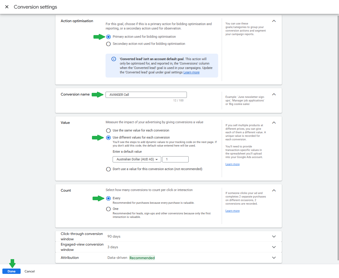 If you wish to change the Conversion Name to something other than AVANSER Call ensure that the Conversion Action Name in your AVANSER Client Portal configuration is exactly identical to your chosen Conversion Name