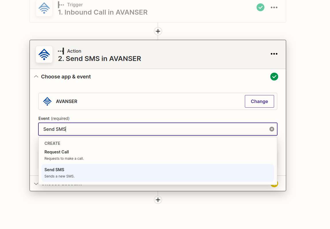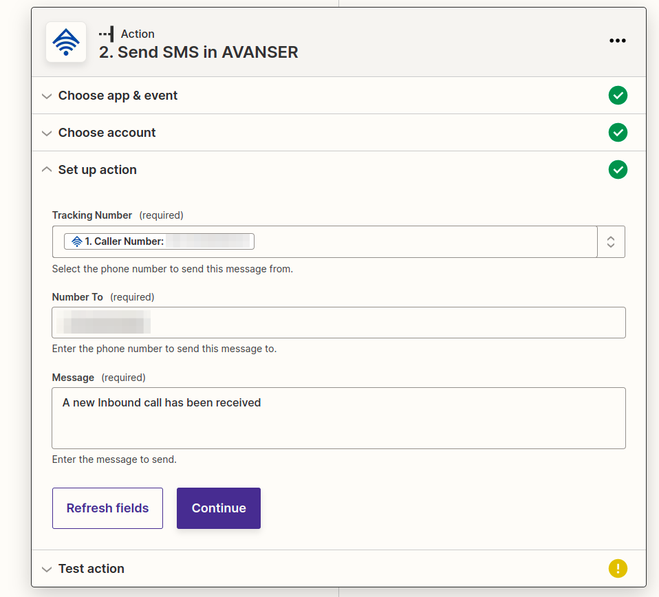 After the completed or skipped test, you will be prompted to make the action that will occur when it is triggered by the chosen setting. In this example we are choosing the AVANSER action of sending an SMS message to a chosen number.