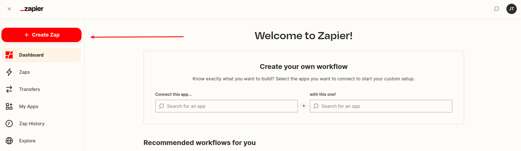 On your Zapier Zaps dashboard found at https://zapier.com/app/zaps click on the "+ Create Zap" button on the top left.