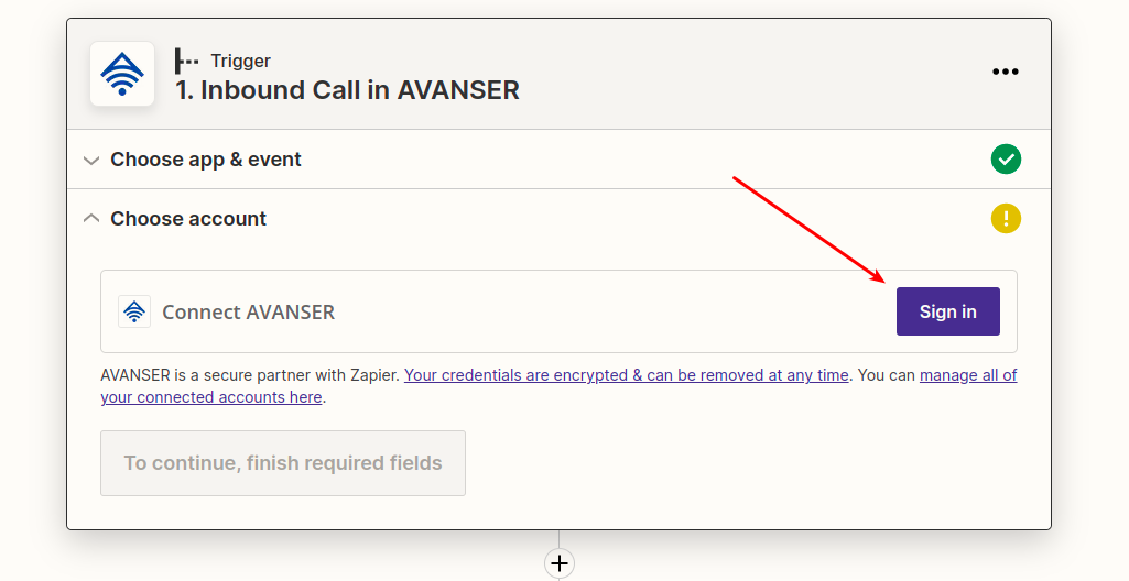With the chosen AVANSER action selected, you will be prompted to enter your AVANSER Customer Portal login details again. If you used an AVANSER login for a trigger, your login details will be saved and can be selected from the drop down menu.